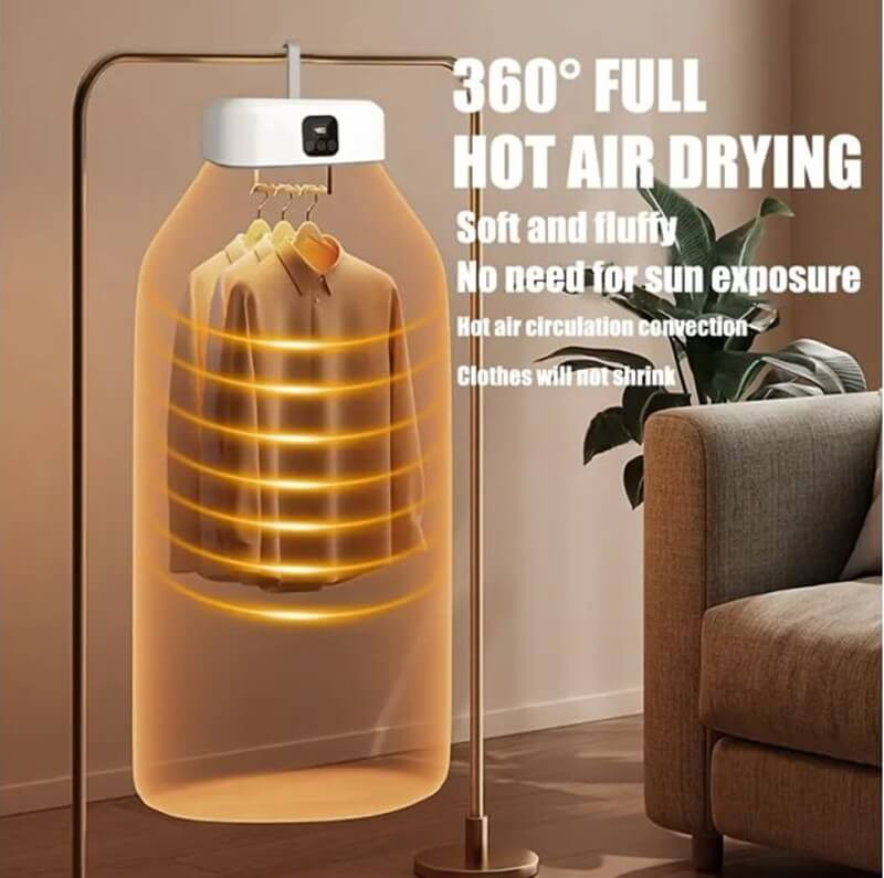 Ez a kompakt és hordozható ruhaszárító tökéletes megoldás a modern otthonokba és utazáshoz. A 360°-os meleg levegő keringtetésnek köszönhetően ruháid gyorsan, egyenletesen és kíméletesen száradnak, megőrizve puhaságukat és formájukat. Többé nem kell aggódnod a helyigényes szárítógépek vagy a napon való szárítás miatt!