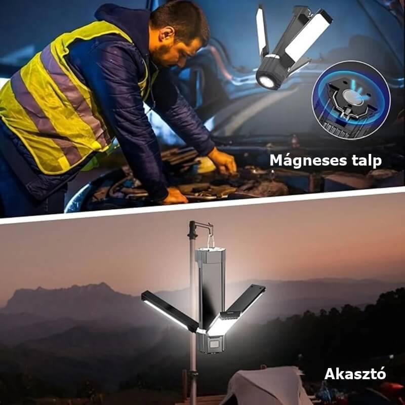 Rugalmas rögzítés – mágneses talp fémfelületekhez, strapabíró acél akasztó fára, sátorrúdra vagy kampóra.