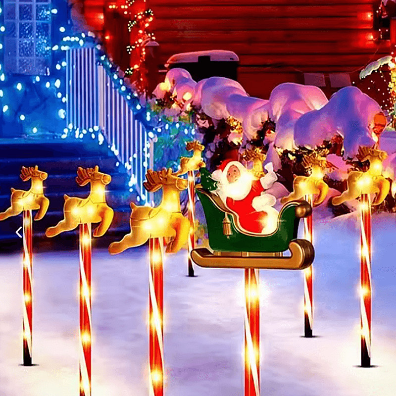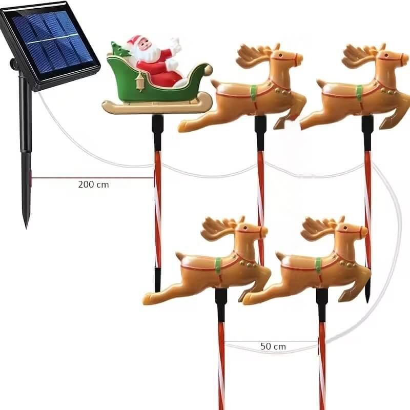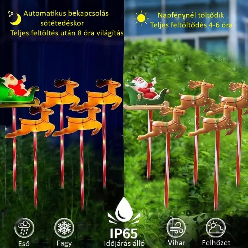 Ez a díszes karácsonyi készlet 5 darab elemből áll: Télapó szánja és a szánját húzó 4 rénszarvas. A dekoráció együttesen egy klasszikus, meseszerű téli jelenetet idéz meg.